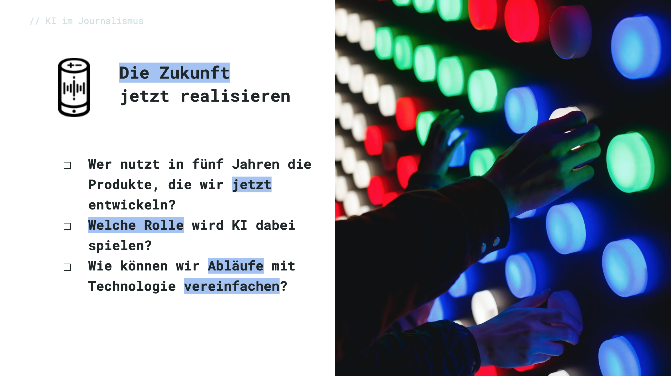 Wir haben aufgezeigt, wie KI in der Zukunft des Journalismus eingesetzt werden kann. Gleichzeitig sind wir auf die Risiken eingegangen, die durch KIs bestehen – wie z.B. Deep Fakes, antrainierte Vorurteile und andere ethische Fragen.