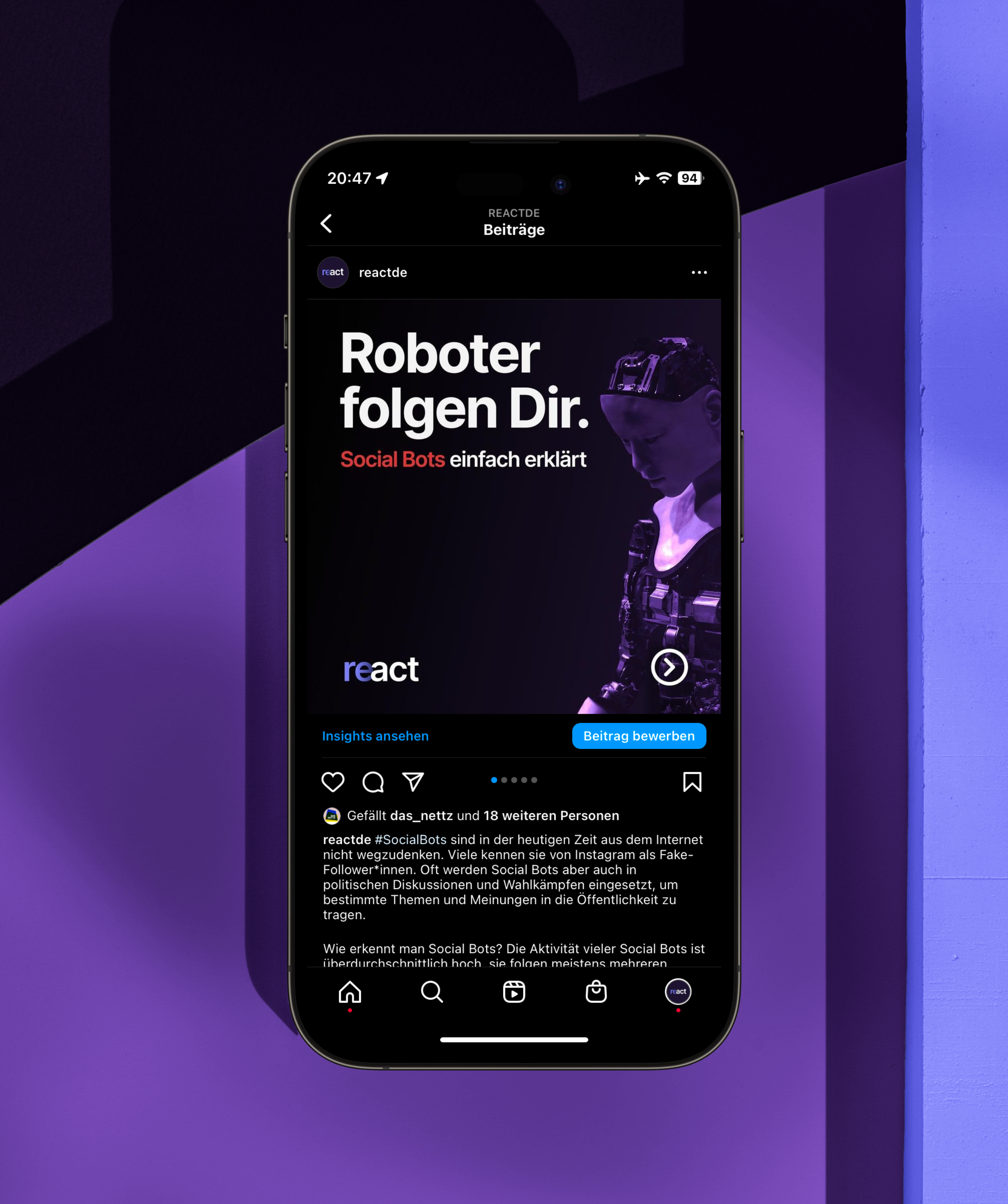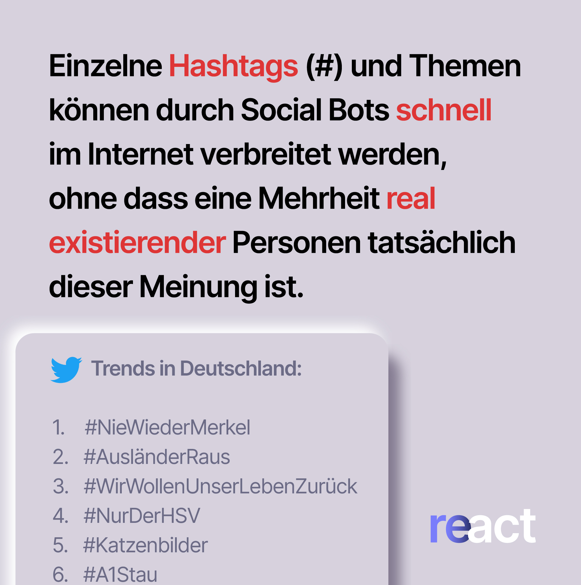 Rechter Hass nimmt im Internet immer weiter zu. Aus diesem Grund thematisierte die konzipierte Social-Media-Kampagne react die Instrumentalisierung Sozialer Medien durch die Neue Rechte und erläuterte mediale sowie rhetorische Strategien in Kombination mit der Erläuterung psychologischer Effekte.